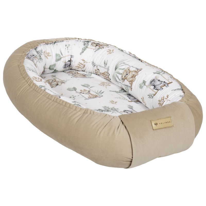 El interior del nido está hecho de algodón y poliéster de la más alta calidad, relleno con fibra hueca siliconada en bolas. Los materiales están certificados. Su tamaño se puede ajustar apretando o aflojando los cordones de algodón. El nido está adornado con una banda de tela elegante que no solo combina perfectamente con el resto de la tela, sino que también cubre las cuerdas utilizadas para ajustar el nido, proporcionando una apariencia estética y una funcionalidad adicional.