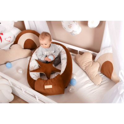 The inside of the baby nest is made of the highest quality cotton and polyester, filled with a polyester fibre. The material is certified. Its size can be adjusted by tightening or loosening the cotton strings. Our new baby nest has been enriched with a large, decorative bow, which is a beautiful and elegant addition. The bow adds charm and makes the baby nest even more unique, combining comfort with subtle style.