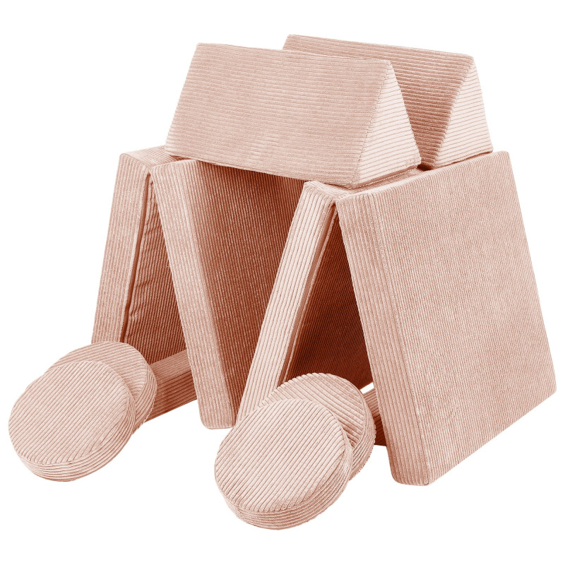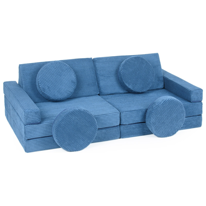 Il divano Velinda non è solo un mobile multifunzionale. È composto da 10 elementi che possono essere liberamente uniti tra loro, creando diverse strutture a seconda delle proprie esigenze e della fantasia. Partendo da vari mobili (poltrona, letto, pouf ecc.), il bambino può anche costruire veicoli (macchina, razzo, escavatore ecc.) e creare edifici.