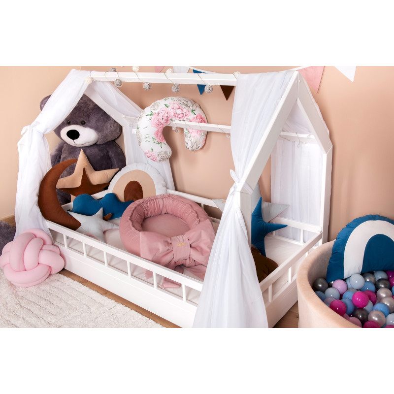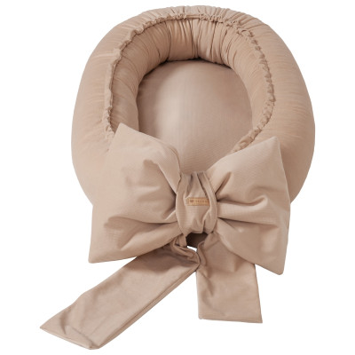 Kokon wykonany jest z poliestru, wypełniony jest kulką silikonową. Materiał jest certyfikowany. Jego wielkość można regulować poprzez ściągnięcie lub poluzowanie bawełnianych troczków. Nasz nowy kokon dla dzieci został wzbogacony o dużą, ozdobną kokardę, która stanowi piękny i elegancki dodatek. Kokarda dodaje uroku i sprawia, że kokon staje się jeszcze bardziej wyjątkowy, łącząc komfort z subtelnym stylem.